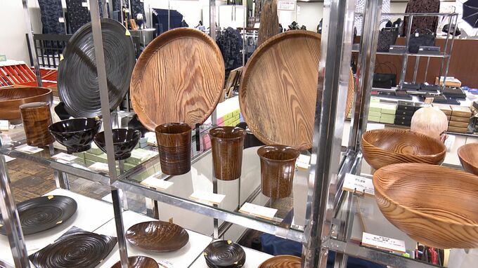 香川県からは、現在、入手困難と言われる、樹齢300年以上経過した黒松を使った椀や盆などの木工食器が並びます。