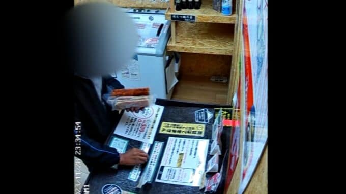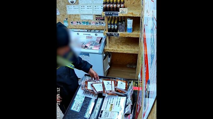 無人販売所に置かれた冷凍庫の扉をあけ、中から取り出したのは「肉」。その後も一心不乱に次々と取り出し、手には6パックの肉が。