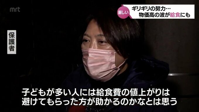 「上がってしまうと家計的にはきついけど、給食の質を落としてほしくないということと、もしも、給食が維持できなくなってお弁当とかになったら家庭の時間に負担がかかってしまうので給食の値上げは仕方ないかなと思います」