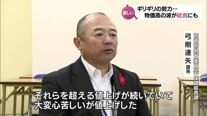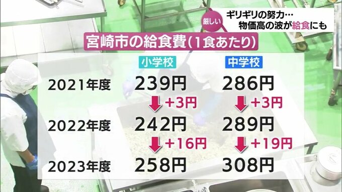 宮崎市は、給食費を2021年度から昨年度にかけて、1食あたり3円程度値上げし、昨年度から今年度にかけても、小学校で16円、中学校で19円程度値上げしている。