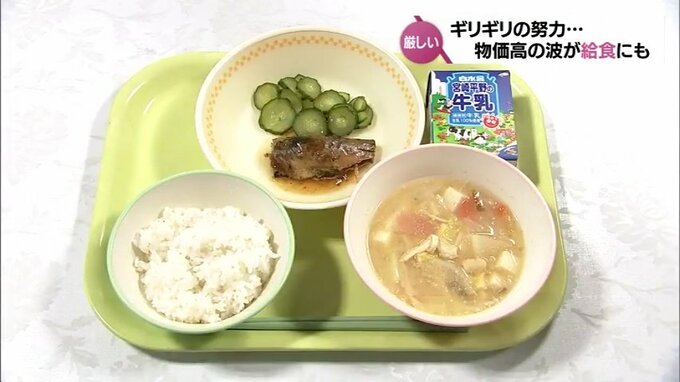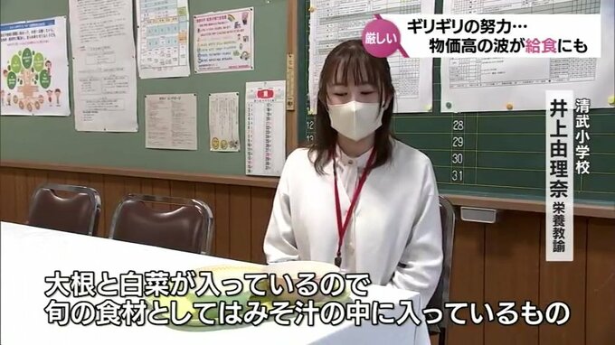 井上栄養教諭によると、このうち牛乳やごはんを除いたおかずに使えるのは、150円から160円程度だという。