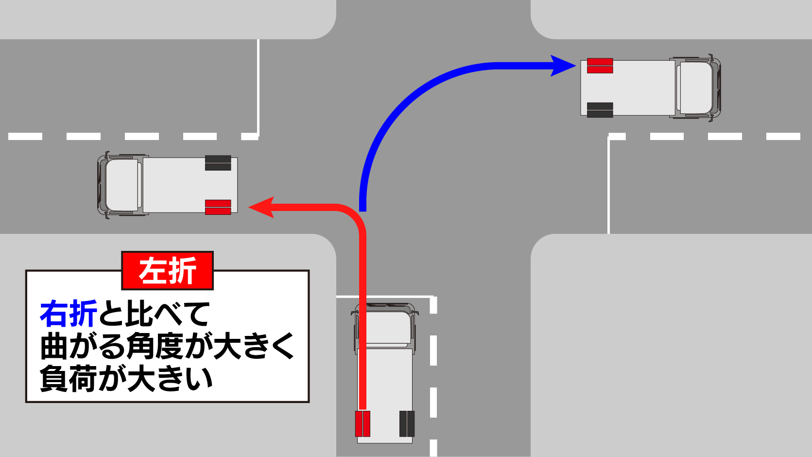 右折と比べて左折は曲がる角度が大きく、左後輪にはよじれるように力が働くため、大きな負荷がかかります。