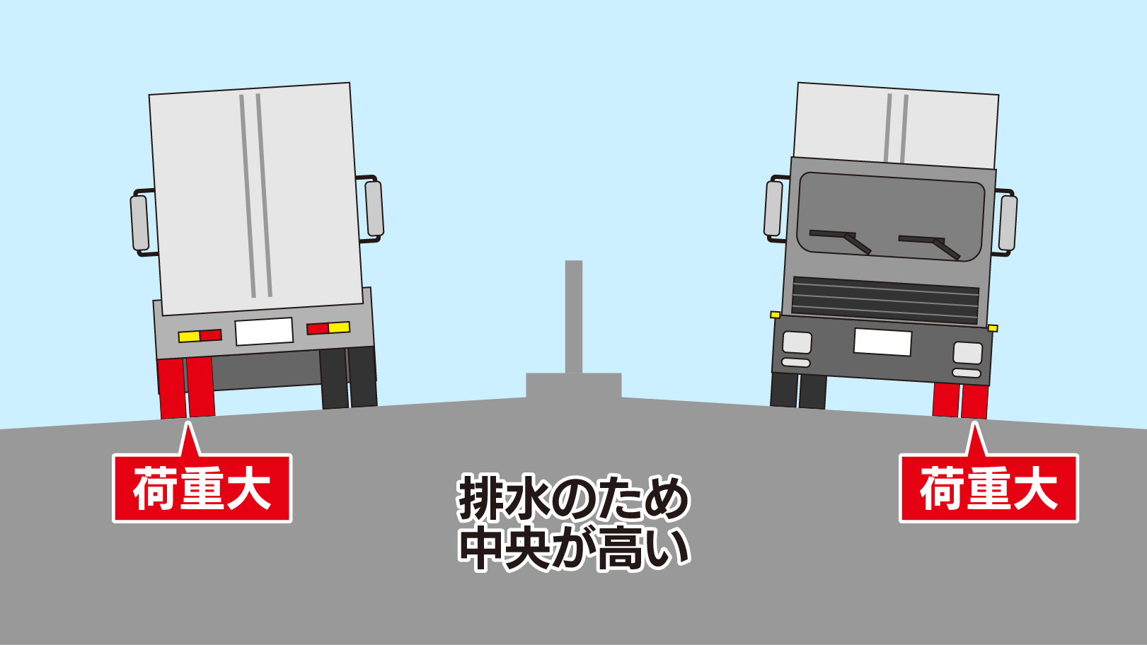 運送業者に対して安全管理の支援などをする一般社団法人運輸安全総研トラバスの阪本浩毅代表理事は、複数の要因が重なり左後輪がダメージを受けやすくなっているとしています。1つ目は、道路の形状です。