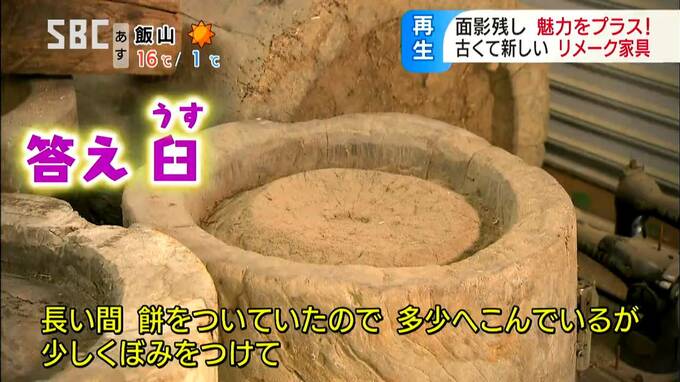 「これは臼です。長い間、臼で餅をついていたので多少凹んでいるんですけど、少しくぼみをつけて、椅子にっていうかたちでちょっと遊んでみた」
