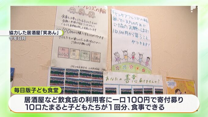 「毎日版子ども食堂」は、居酒屋など飲食店の利用客に一口100円で寄付を募り、10口たまると子どもたちが1回分、食事ができるという仕組みです。