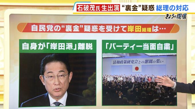 (石破茂 衆議院議員)そうすると当選回数が若く、資金がない人たちは、今まで派閥でパーティーやってそこから支援してもらえると思ったのに、今度からどうしたらいいの?って話になりますよね。『パーティーが駄目なんじゃない、出と入りをきちんと明確にしてね』と世の中が言っているのに、パーティー自粛って何だ?忘年会・新年会を全部なぜやめるのがわからない。