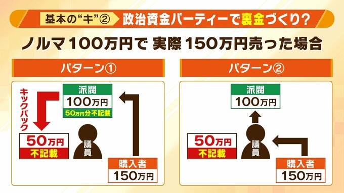 ーー政治資金パーティーをめぐる疑惑についてです。例えば、ノルマ100万円として、実際には150万円売った場合です。150万円が派閥に入り、そのうちノルマ分より多い50万円がキックバックされて議員に入るというパターン。派閥の方は50万円分が不記載で、そして議員の方も不記載に。これが問題だと言われています。パターン2は、150万円がまず議員に入って、ノルマ分の100万円を派閥にあげて、そして50万円は自分がキープするというもの。不記載なのが問題ということでしょうか?
