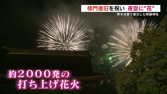 阿蘇市では、熊本地震で被災した阿蘇神社の楼門が復旧したことを祝う花火が打ち上げれました。熊本地震で倒壊した阿蘇神社の楼門は、元の形に再建され、今月、7年8か月ぶりに復旧しました。9日夜は、楼門の下で演…