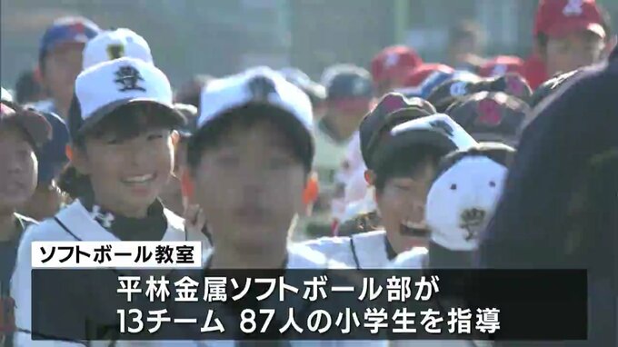 全国屈指の強豪チーム、岡山市の平林金属ソフトボール部の男女メンバーが小学生約90人を指導しました。