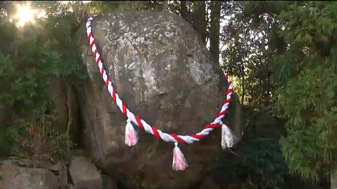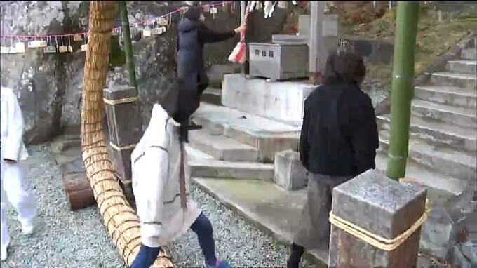 10日は、斜面からせり出した石に紅白のしめ縄も取り付けられました。神社では、正月三が日の参拝者を1万人と見込んでいます。