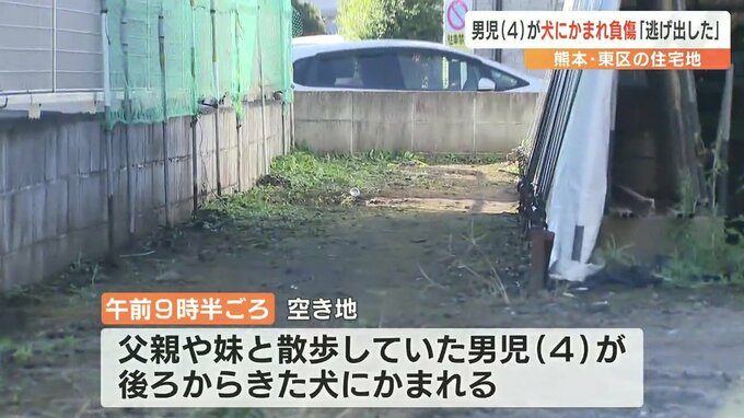 10日午前、熊本市の住宅地で4歳の男の子が犬にかまれ、けがをしました。警察などによりますと、10日午前9時半ごろ熊本市東区戸島(としま)の空き地で、父親や妹と散歩していた4歳の男の子が、後ろからきた犬にか…