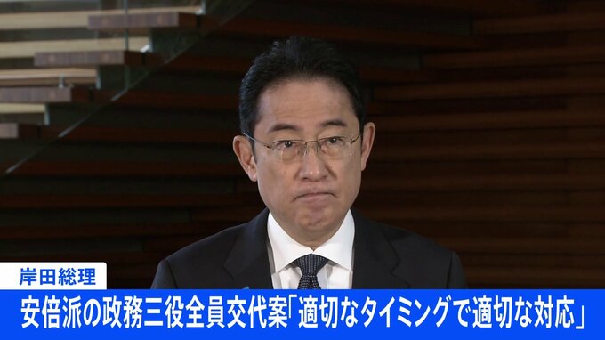 自民党・安倍派の政治資金パーティーの問題をめぐり、政権内に安倍派の政務三役全員を交代させる案が浮上していることについて岸田総理は、「国政の遅滞を生じさせないために、適切なタイミングで適切な対応を考え…