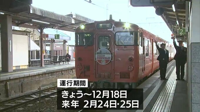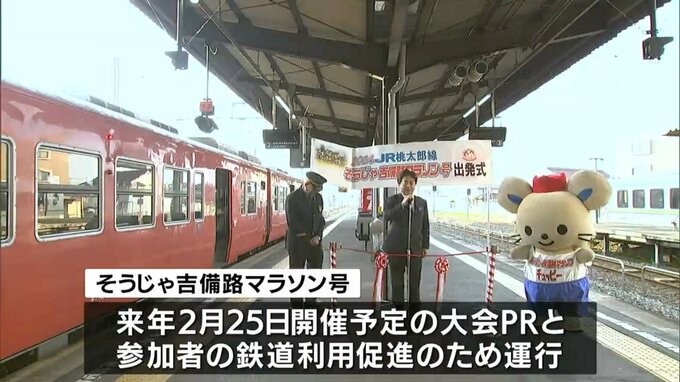 来年2月25日に開催が予定されている大会のPRと、参加者の鉄道利用促進のため運行されるもので、JR総社駅のホームで行われた出発式ではテープカットで運行開始を祝いました。