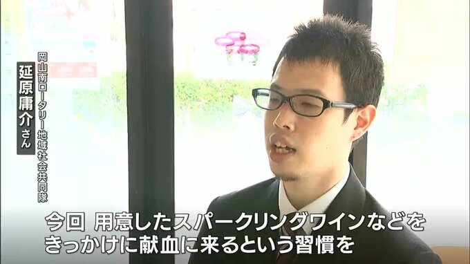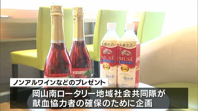 岡山市北区にある献血ルーム「ももたろう」では、献血した人たちにノンアルコールのスパークリングワインや乳酸菌ドリンクがプレゼントされました。岡山県内の献血状況は今年7月から5か月間、確保する目標を下回っているということです。