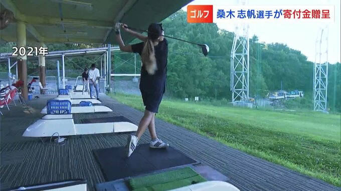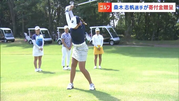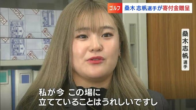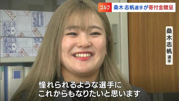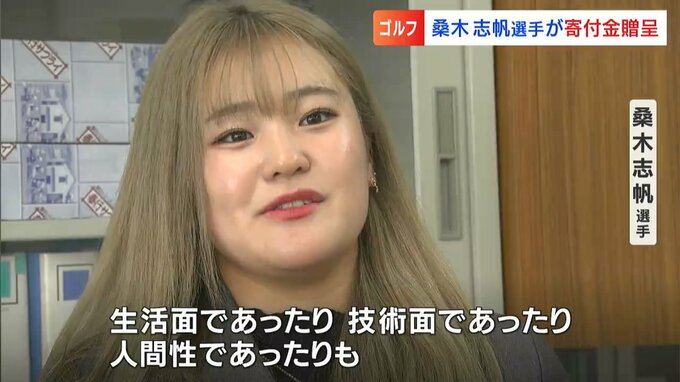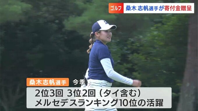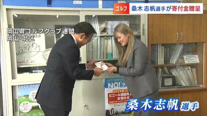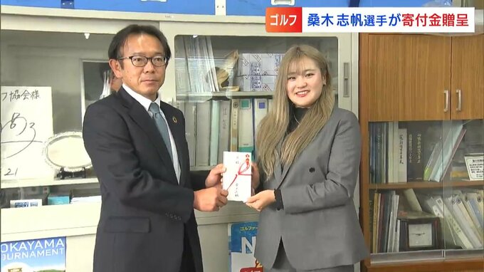 今季、国内ツアーで快進撃を見せた岡山市出身の女子プロゴルファー・桑木志帆選手が、ジュニア選手の育成に役立ててほしいと寄付金を贈りました。