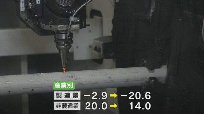産業別では製造業が-2.9から-20.6へ、非製造業は20.0から14.0と、いずれも悪化しています。