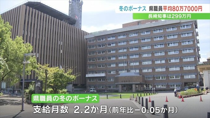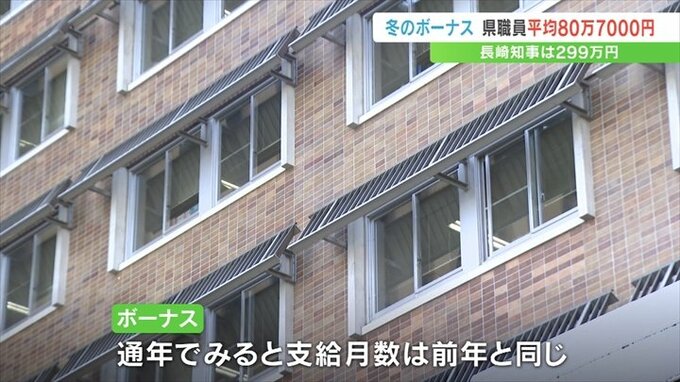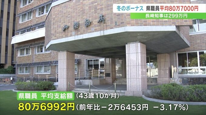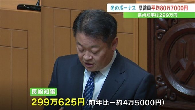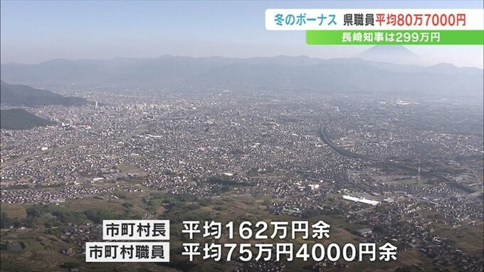 なお長崎知事のボーナスは2022年の冬より約4万5000円減少した299万円余りで、市町村長の平均は162万円あまり、市町村の職員の平均は約75万4000円で、こちらも前の年より減少しました。