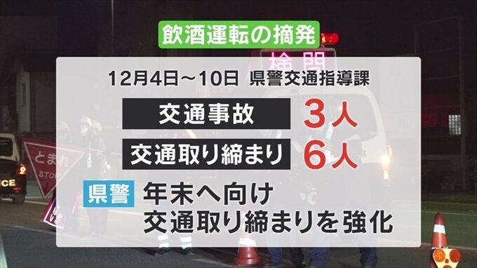 県警交通指導課によりますと、12月4日から10日までの1週間に、県内で飲酒運転による交通事故で3人を摘発しました。