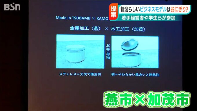 燕市の金属加工技術と加茂市の木工加工技術を合わせた「お弁当箱」など、新潟らしさが詰まった事業を提案していました。
