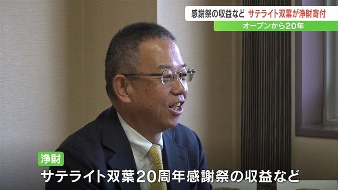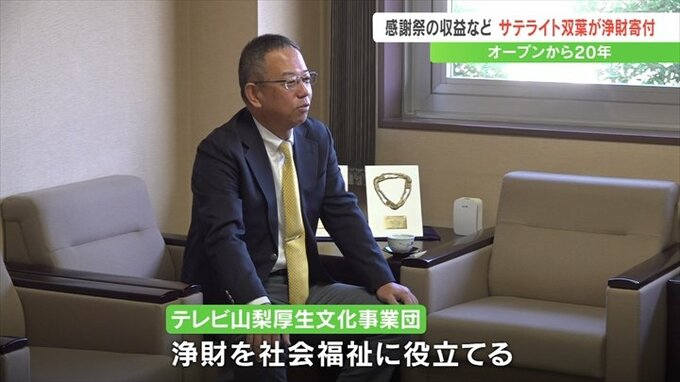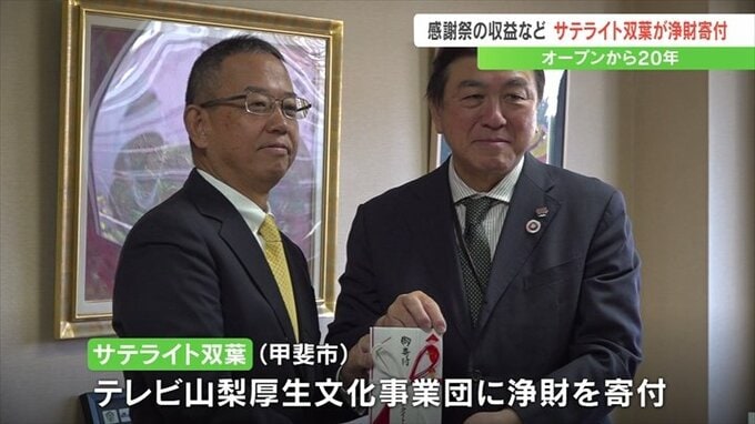 オープンから20年を迎えた山梨県甲斐市のサテライト双葉が、テレビ山梨厚生文化事業団に浄財を贈りました。