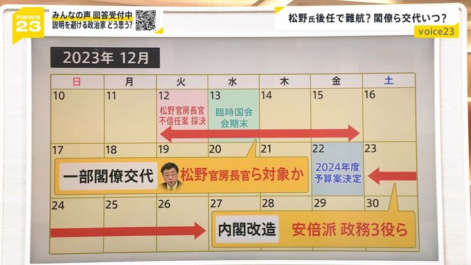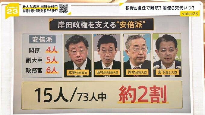 岸田政権を支える安倍派として、閣僚には、松野 官房長官、西村 経産大臣、鈴木 総務大臣、宮下 農水大臣の4人、ほかにも、副大臣に5人、政務官に6人。政務三役73人中15人、約2割が安倍派という状況。今後、安倍派が一掃されるという流れになるのでしょうか?