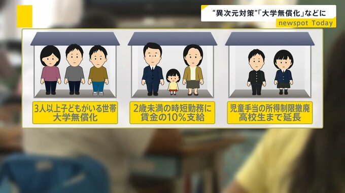 また、▼2歳未満の子どもを育てながら時短勤務をする人に賃金の1割に相当する額の給付をする方針を示しました。▼児童手当の所得制限を撤廃し、高校生まで延長することなども盛り込まれました。