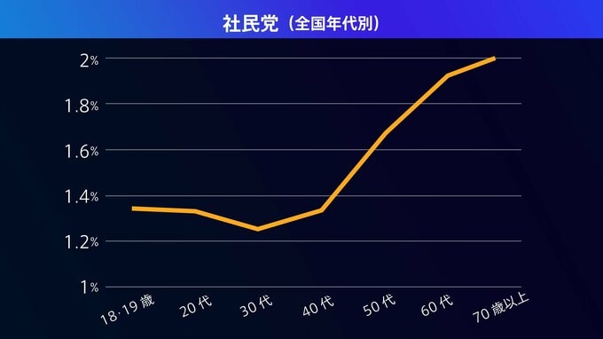 さらに年代別のデータを見てみると、共産党と社民党は、30代以降で年齢が上がるにつれて、投票した人の割合が増えていくのも大きな特徴です。