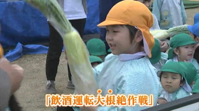 年末年始、飲酒の機会が増える時期です。倉敷市内の園児たちが大根を使った交通安全への取組み、その名も「飲酒運転『大根』絶作戦」を行いました。