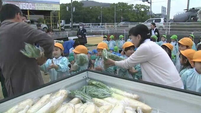倉敷市東塚のあさひ幼稚園の畑で、園児たちが大根を受け取ります。