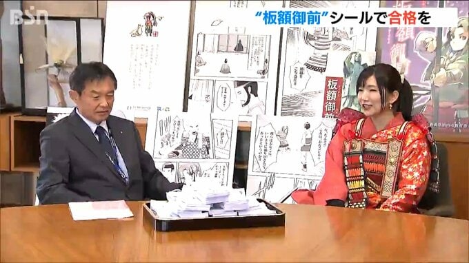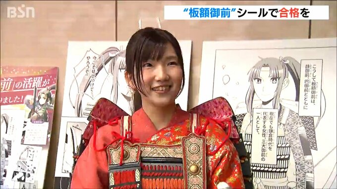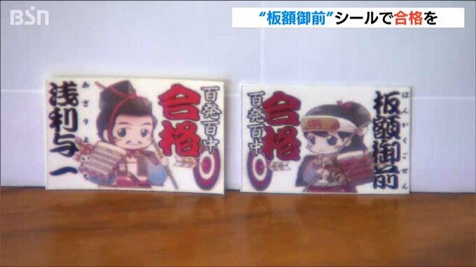 板額御前は百発百中の弓の名手として知られていて、受験生に「合格」を射止めてもらおうと地元の市民団体が板額御前と夫で同じく弓の名手・浅利与一(あさり・よいち)が描かれたシールを毎年受験生に贈っています。