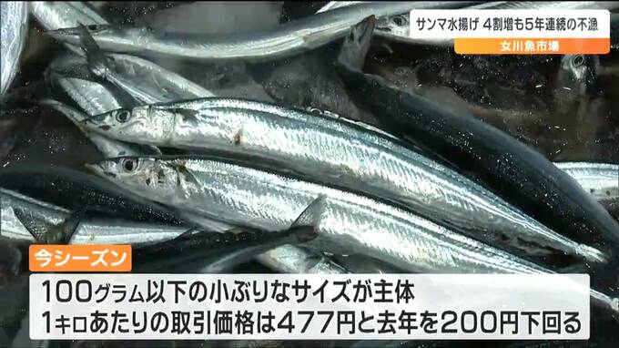 今シーズンのサンマ漁がほぼ終了しました。宮城県の女川魚市場の水揚げ量は、去年より40%以上増えたものの、5年連続の不漁に終わりました。