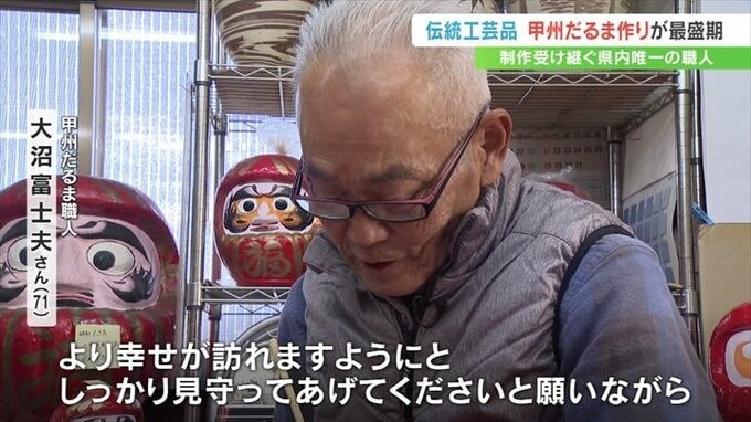 真剣な眼差しで筆を走らせているのは、今では山梨県内唯一という甲州だるま職人=大沼富士夫さん71歳です。