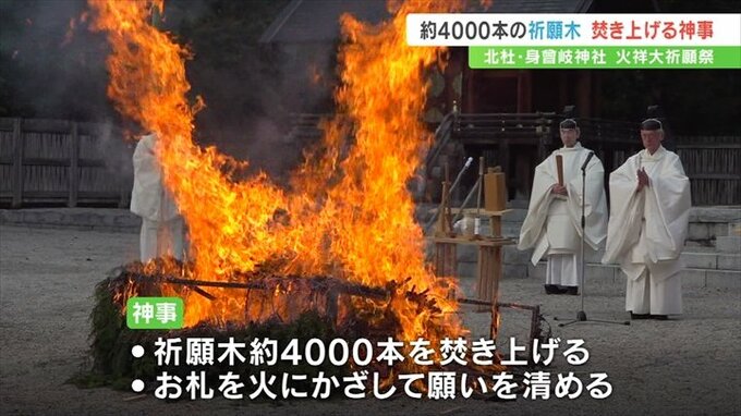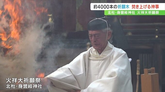 神事は本殿前の庭で行われ、全国から訪れた参拝者が願いを書いた祈願木、約4000本が焚き上げられました。