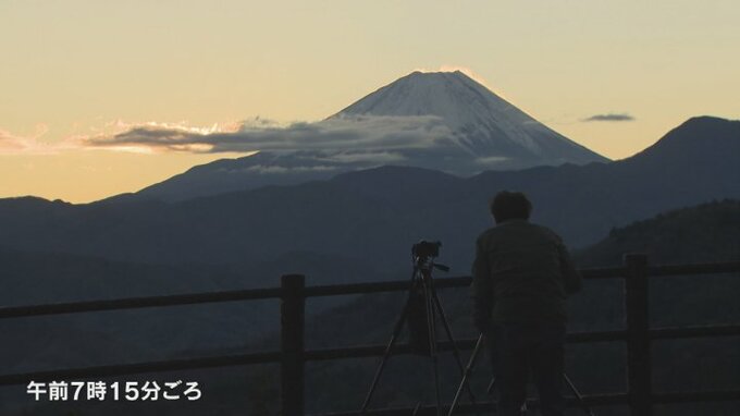 山梨県富士川町高下地区で、この時季ならではの絶景、富士山の山頂から朝日が昇るダイヤモンド富士が見られました。