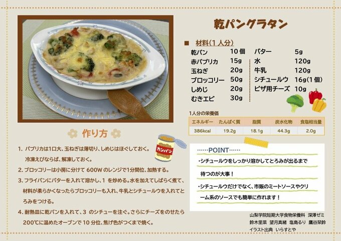 マカロニよりも乾パンの方がグラタンの中でしっかりと存在感をしめしてくれます。パンと牛乳の相性もよく食べ応えのある一品です。