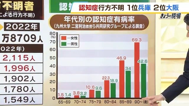 (花田一志医師) アルツハイマー病は、女性が多いというデータがありますし、寿命が長い分だけ、数が多くなるんだろうなとも思うんですけれども、有症率もちょっと多いです。やはりどこかに行ってしまい、いなくなったというケースは多く、見つかるケースも、ガソリンスタンド、コンビニ、24時間開いてるところが多いかなと思うので、そういうところと連携して、地域で見つけていく体制も必要だと思います。