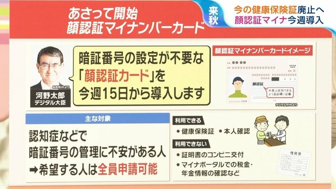 それが「顔認証マイナンバーカード」。暗証番号の設定が不要なマイナンバーカードで、認知症などで暗証番号の管理に不安がある方を対象としています。希望する方は全員申請することが可能です。