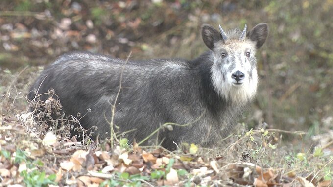 tbc本社構内に現れたのは体長1メートルほどのニホンカモシカです。エサを求めて山を下りてきたのでしょうか…カメラをずっと見つめるカモシカ。逃げる素振りは見せず、足場の悪い斜面に5分ほど留まった後、茂みの中に姿を消しました。