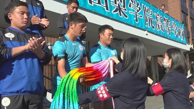 ラグビー部など5つの運動部が冬の全国大会に出場する山梨学院高校で、選手たちを激励する壮行会が行われました。山梨学院高校からはラグビー部、男女の駅伝部、ホッケー部、スケート部が冬の全国大会に出場します…
