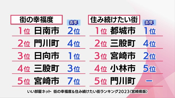 一方、「住み続けたい街」の県内トップ5、三股町、宮崎市、小林市、門川町が入っています。