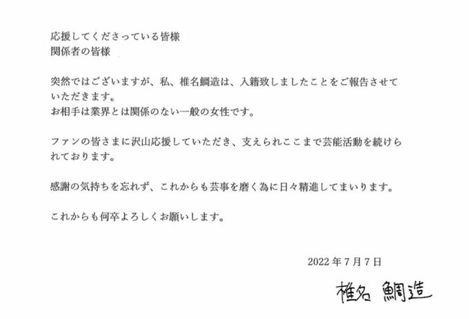 突然ではございますが、 私、 椎名鯛造は、 入籍致しましたことをご報告させていただきます。