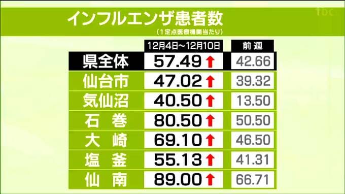 保健所別では、仙南で89人、石巻で80.5人、大崎で69.1人など全ての保健所管内で前の週よりも増加しました。