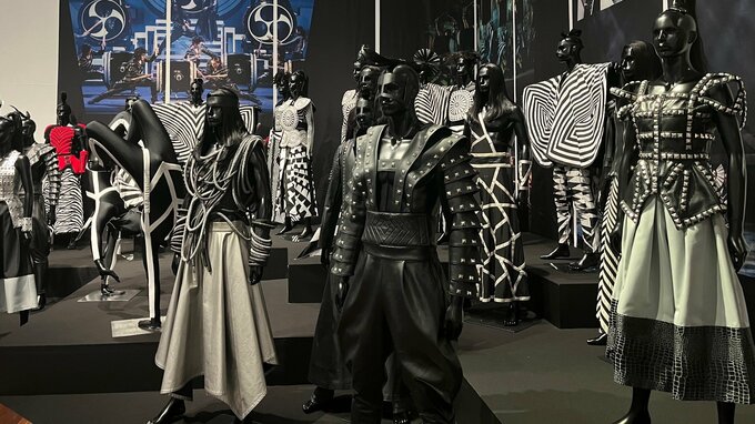 後半に展示されるのは、見どころの一つである華やかな衣装をまとったマネキン。約 25m にもおよぶ作品群は、まるでファッションショーのランウェイさながら。マネキンがまとうのは、2015 年に京都国立博物館で開催された特別展覧会「琳派誕生 400 年記念 琳派 京(みやこ)を彩る」のオープニングショーで、コシノさんが「能とモード」をテーマにファッションショーを行ったときのもの。