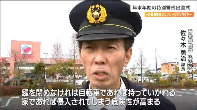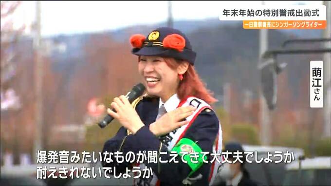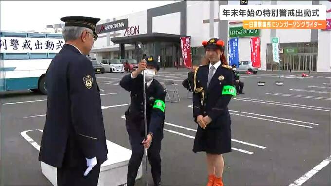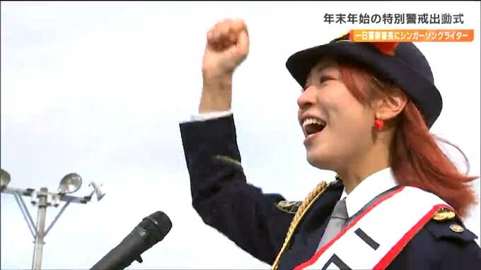 年末年始のパトロールを強化する特別警戒の出動式が14日、宮城県石巻市で行なわれました。一日警察署長に任命されたシンガーソングライターは、ハプニングをものともせず持ち前の明るさで防犯を呼びかけました。