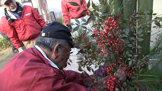 竹の周りには松竹梅をはじめ、公園内で育てた葉牡丹などの縁起物が飾り付けられ、高さ1.8メートルの門松が完成しました。