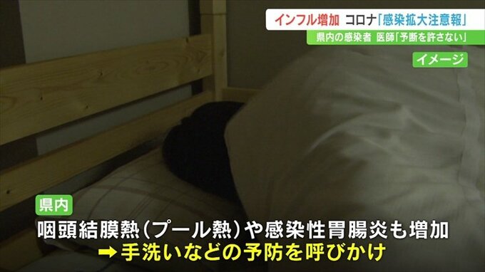 この他、夏かぜの一種の咽頭結膜熱いわゆるプール熱や、ノロウイルスなども増加していて県は、手洗いなどの予防策を呼びかけています。