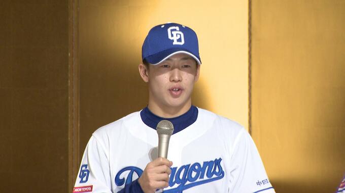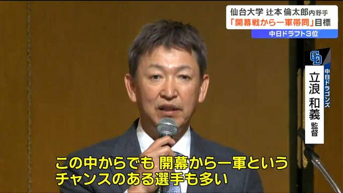 名古屋市内で行われた中日ドラゴンズの新入団選手発表会見。ドラフト3位で指名を受けた仙台大学の辻本倫太郎内野手がプロへの抱負を語りました。