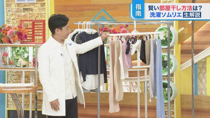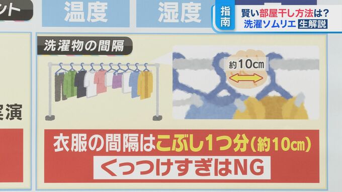 室内干しは、洗濯物を干す間隔がどうしても狭くなりがちですが、やはりくっつきすぎはNG。最低こぶし1つ分、10センチはあけてほしいとのことです。