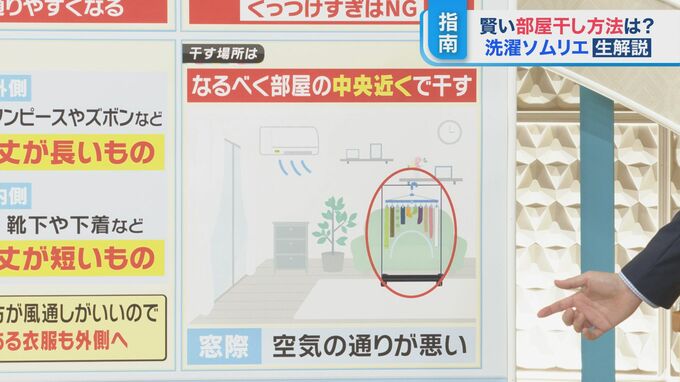 部屋干しだと窓際に干しがちですが、窓際だと空気の通りが悪いので、部屋の中央で干す方が良いとのことです。そして同時に、