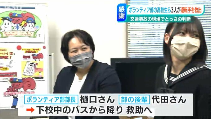 当時下校中で、バスに乗っていたボランティア部・部長の樋口さんと後輩の代田さん。バスから降りるとすぐ救助にあたりました。